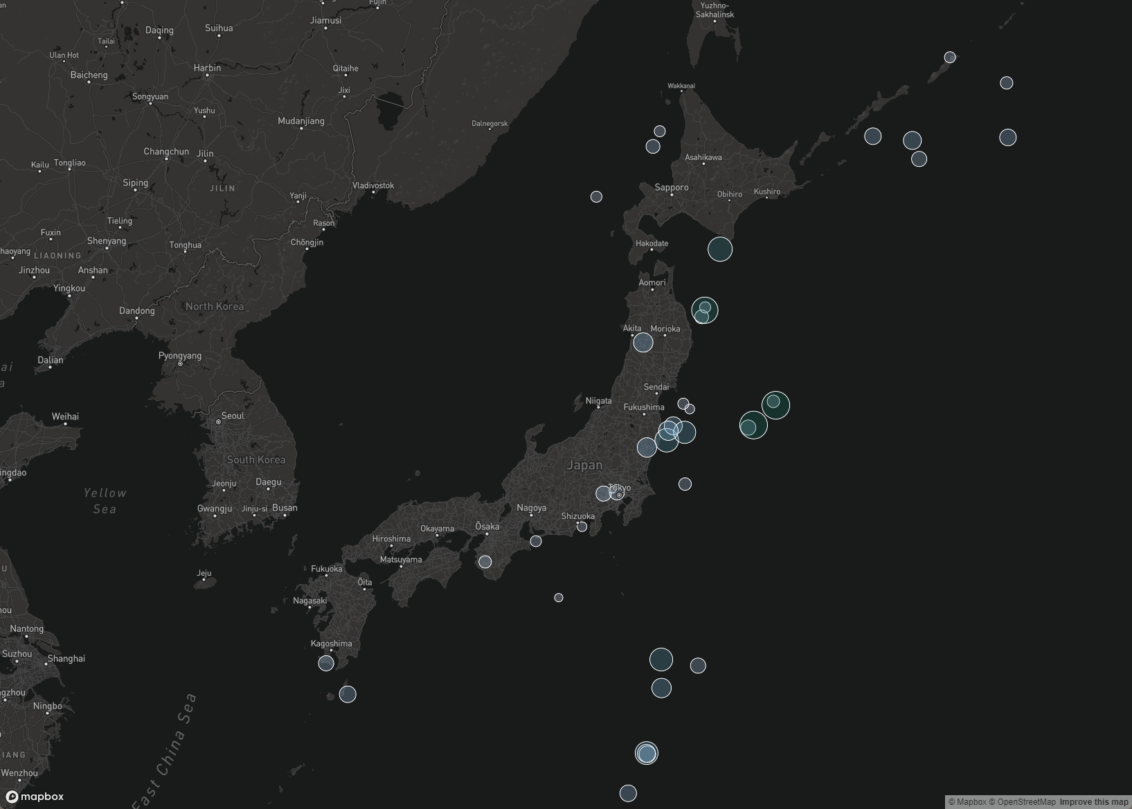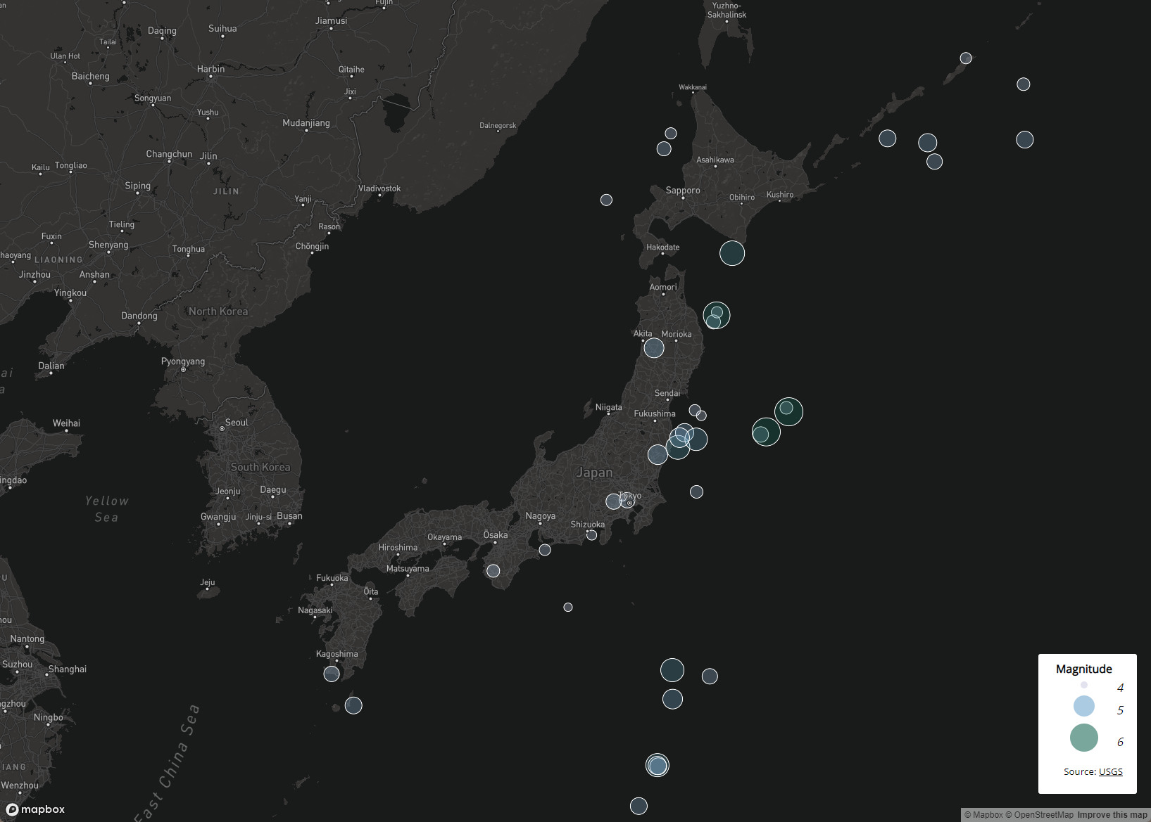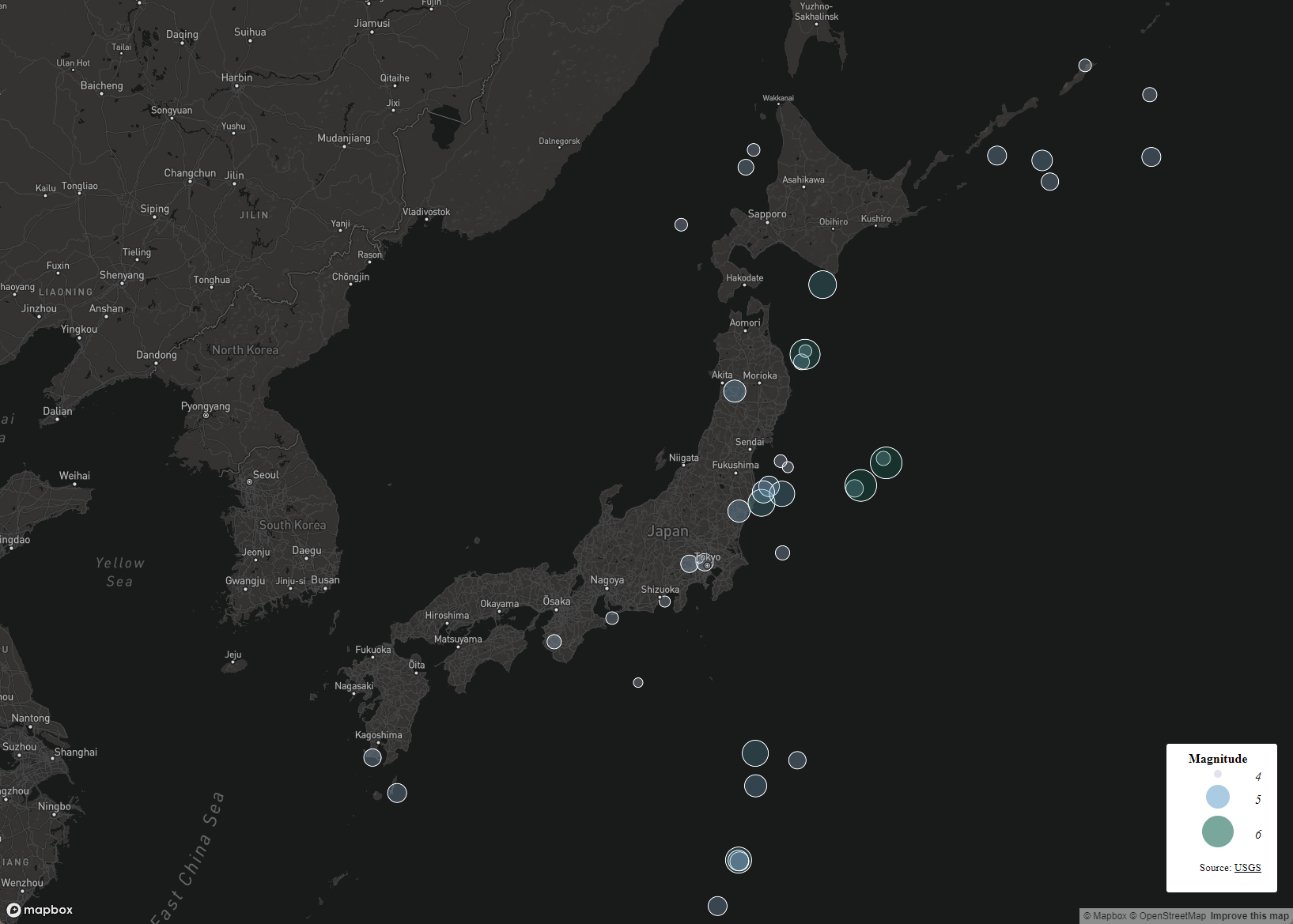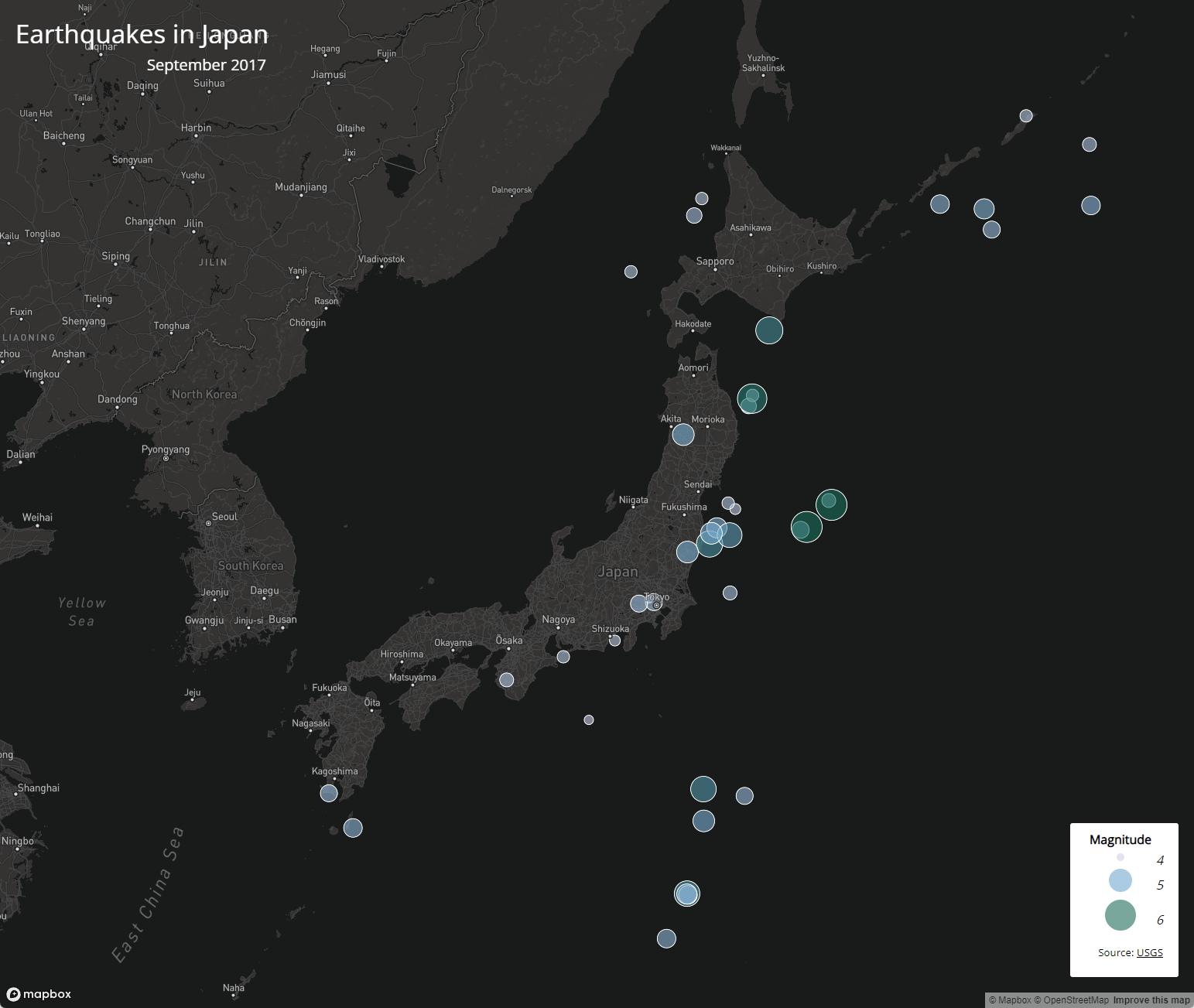 In this lab, we will design a web map application. This application is a proportional symbol map of earthquakes near Japan in 2017. When creating a web map, one crucial work is to symbolize the map elements to provide proper message about the raw data. This increases legibility for users and can give your map an appealing, custom design. An thematic map can includes base maps, thematic layers (i.e., choropleth, proportional symbols, dot density, etc), and interactive features (the components of the map that allow for user interaction). To make this map, we have gathered earthquakes taking place near Japan in September 2017. The data are from USGS earthquake catalog. Below is the web map you will make after walking through this lab handout.