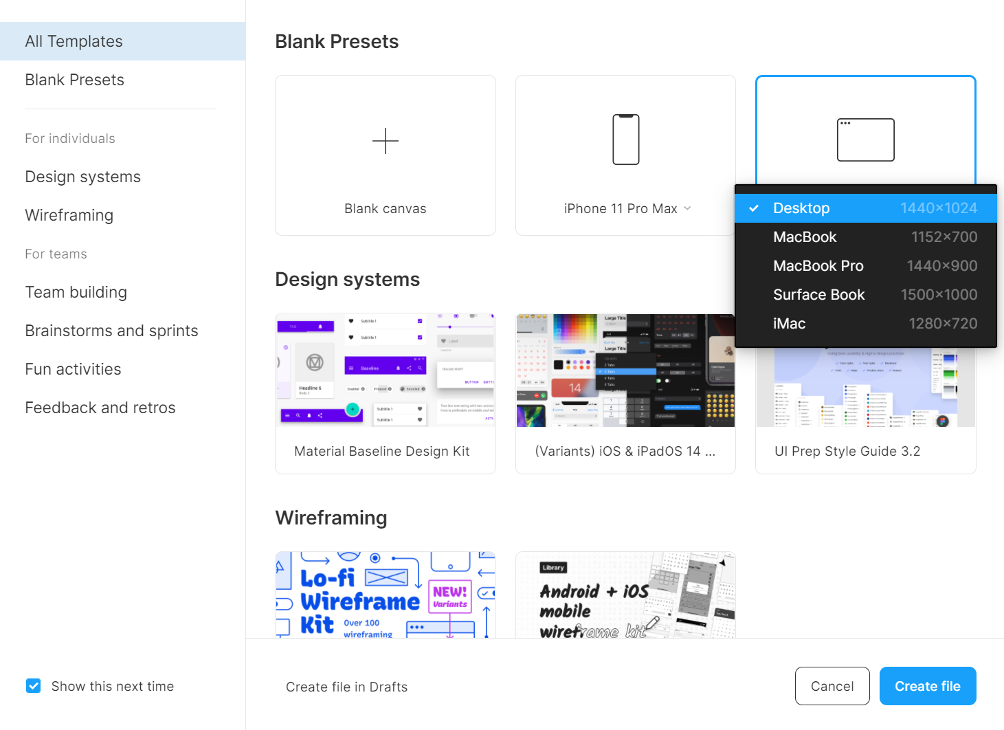 In the template window, under Blank Presets, check Desktop with default size of 1440 x 1024 as it is one of the most common screen sizes today.
