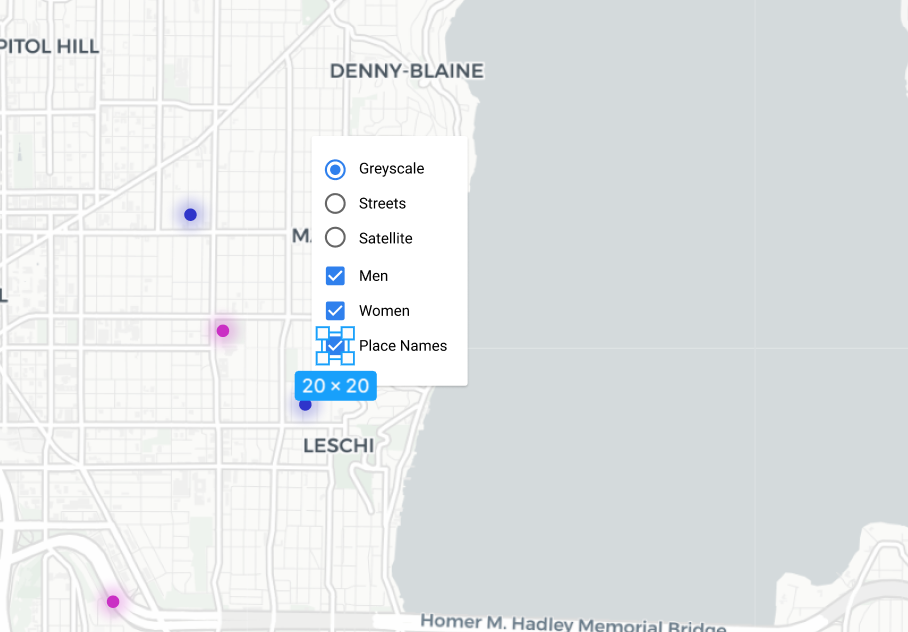 In this part, we will add the venues to the map. In the urban LGBTQ+ space, there are many types of venues with different ways to categorize them. For this part, we will only separate the venues into two categories: men (blue) or women (purple) related places. We will add more info later in the hover over functions.