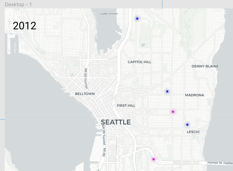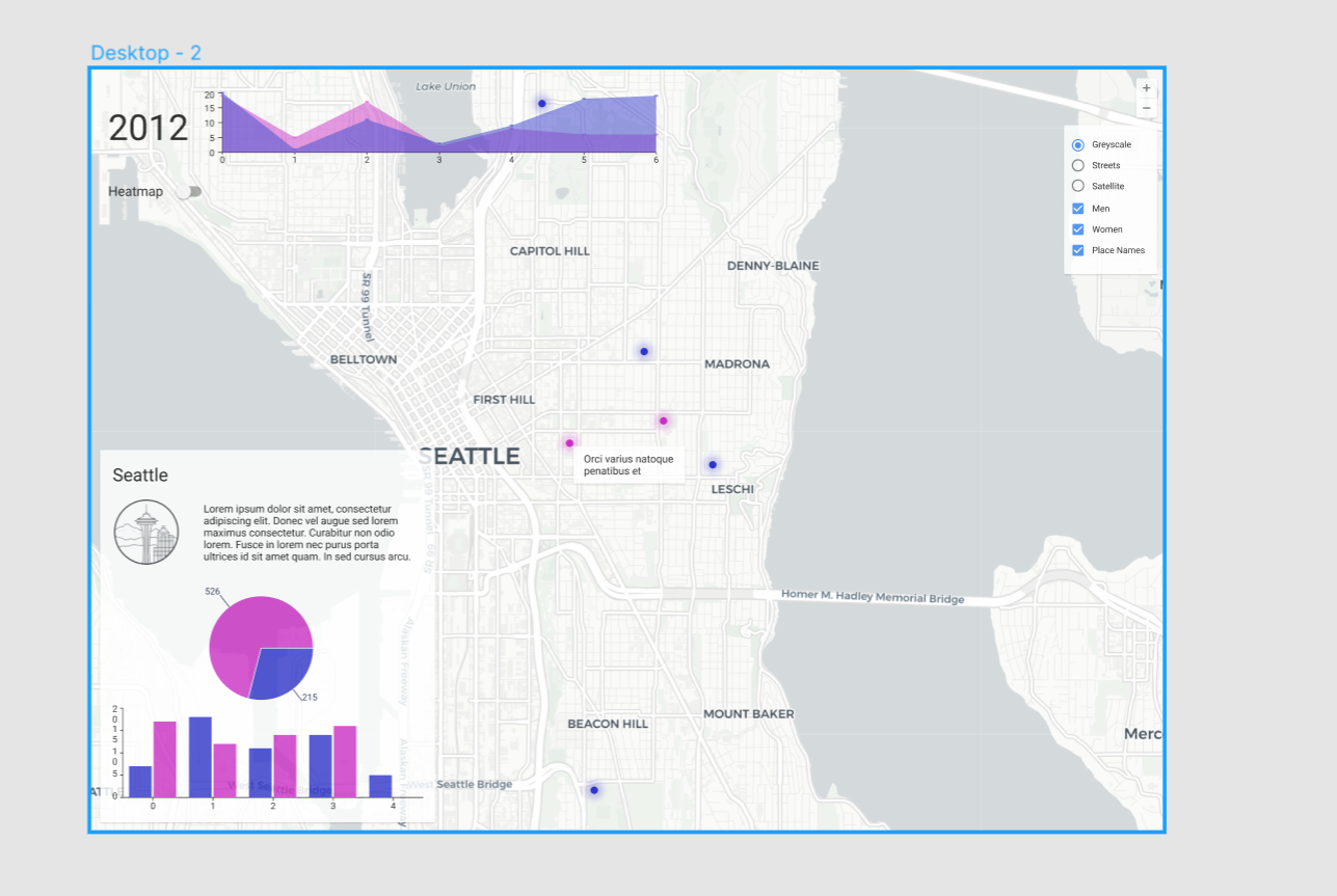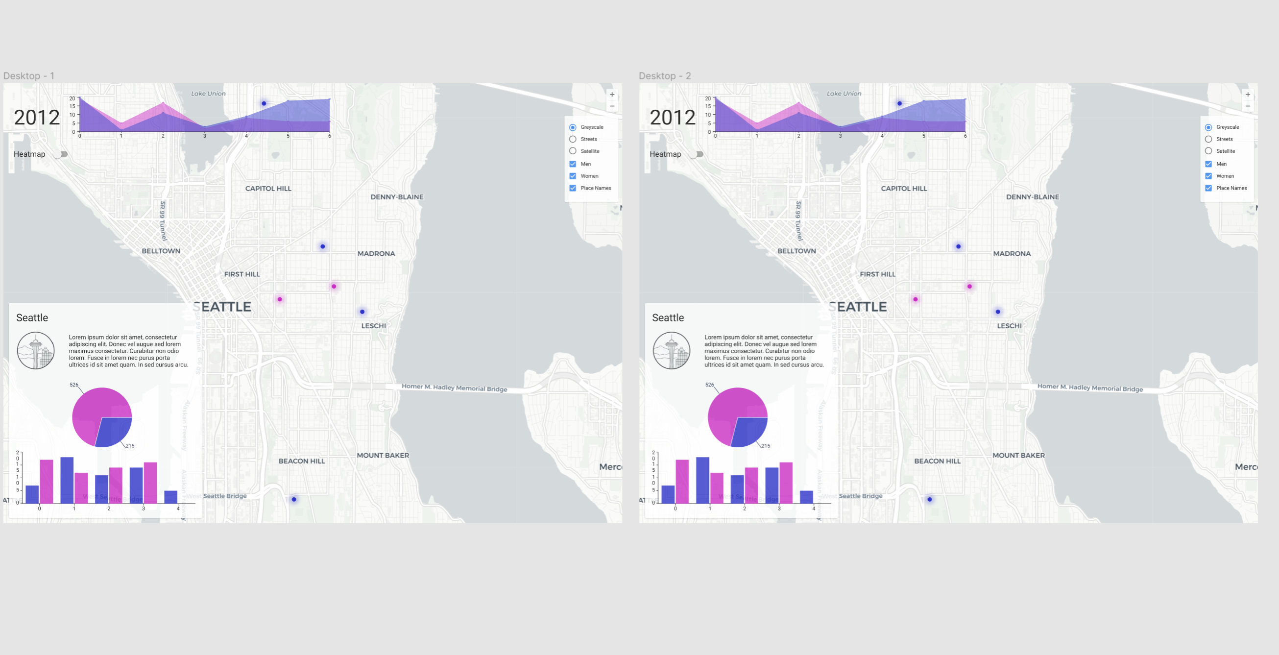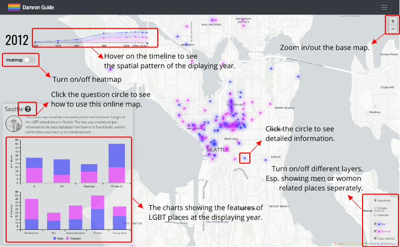 The project we are designing the mockup for is called Damron Guide: Seattle, it is a website utilizing online maps to visually explore the Damron’s Travel Guide which specifies the spatial pattern and temporal changes of the LGBT related places. Especially, The evolving space of LGBTQ life in Seattle in the past five decades. For more information, you could visit this web site.