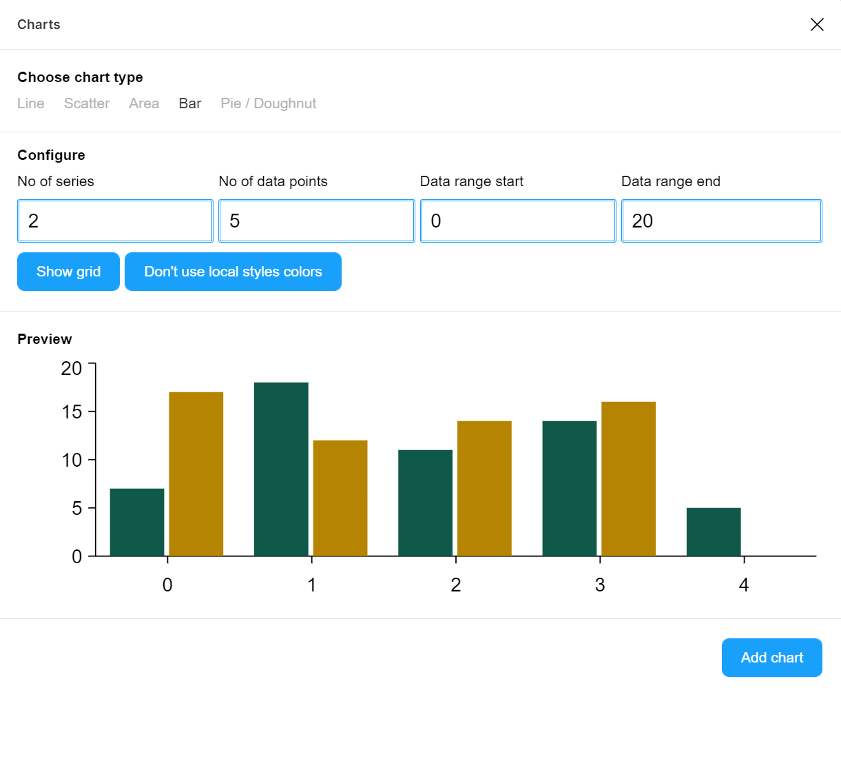 Choose the Area chart, under Configure, Change No of series to 2, No of data points to 7, Data range start to 0, Data range end to 20, select Hide grid and Use local styles colors, and click Add chart at the bottom right of the window.