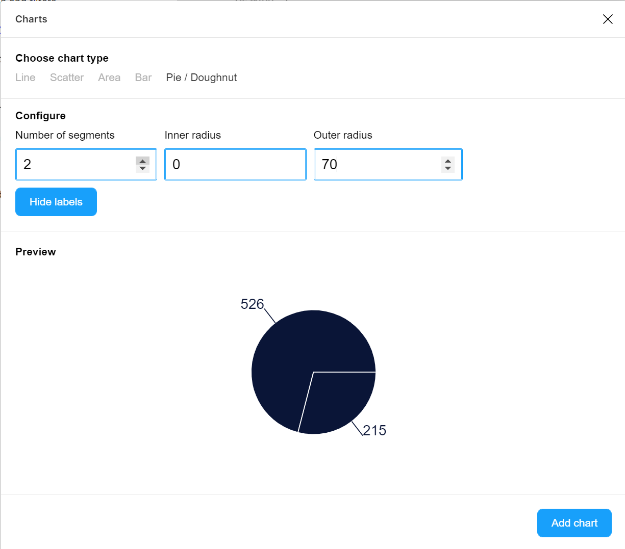 Choose the Pie / Doughnut chart, under Configure, Change No of Segments to 2, Inner radius to 0, Outer radius to 70, and select Hide grid, and click Add chart at the bottom right of the window.